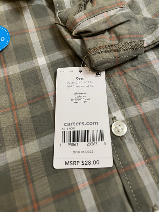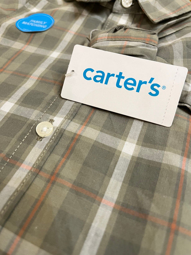 پیراهن نوزادی پسرانه، چهارخانه زیتونی، نخ پنبه از برند محبوب کارترز